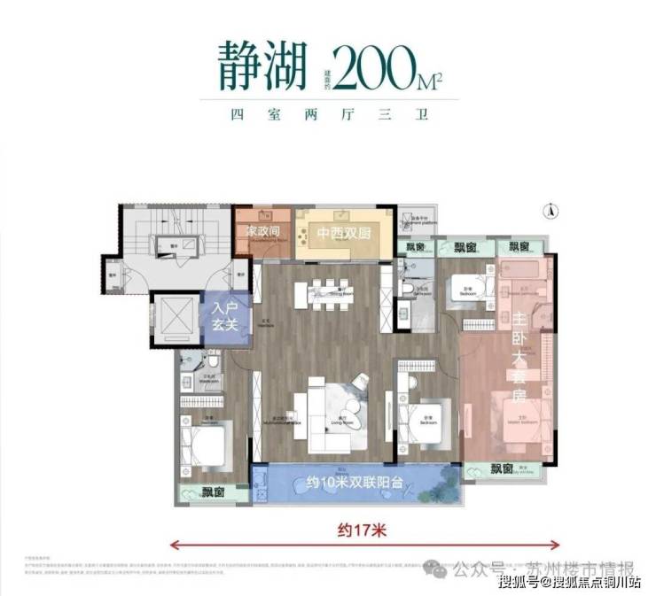 约17米的超大面宽:南向3间卧室+横厅实现4开间朝南,面宽直接做到了约17米;若把南向次卧打通,还可以得到一个近10米的超宽超奢大横厅,可满足100寸电视的观影距离,家里秒变巨幕影院。