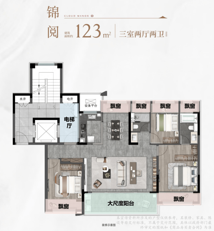作为社区主力户型,建面约123㎡三房两厅两卫以“一梯两户+电梯双开”设计,实现独立入户门厅,归家仪式感拉满。