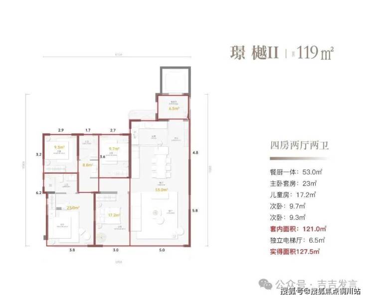为33层设计,三梯四户配置,每户都有独立电梯厅,居住私密性与仪式感双在线。从东到西依次分布119㎡-96㎡-96㎡-119㎡,仅128户。
