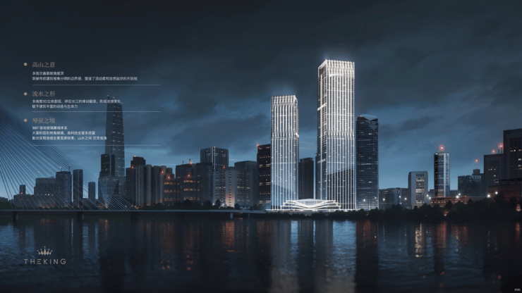 建筑设计:采用 360° 纯粹环幕落地玻璃幕墙体系,搭配横向金属铝板线条造型,突破传统建筑棱角分明的边界感,塑造出长江自然起伏的流动天际线,赋予建筑丰富的动感与生命力。