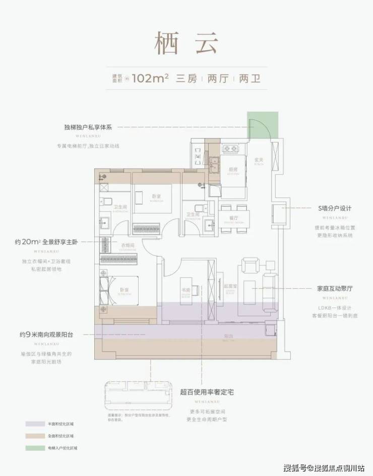 中间户102㎡,通过“分户S墙”优化动线,赋予厨房更多可能性,与户内玄关形成更灵活的复合空间。