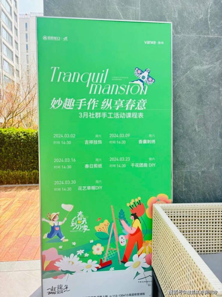 在中央景观轴的会客厅里,每周都会举办室内活动。比如3月份就有香囊刺绣、干花团扇DIY、花艺草帽DIY等手工活动课。