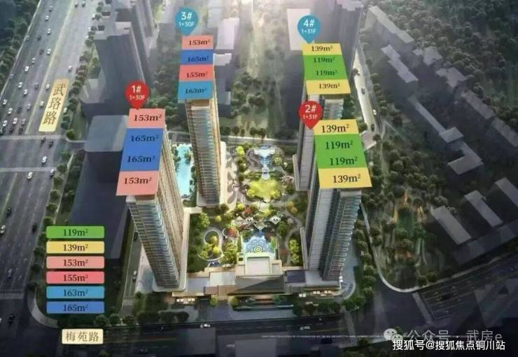 其中 1栋,3栋,5栋,6栋,7栋,9栋带空中花园纯四代产品,其余楼栋为封闭式公建化外立面,楼栋错开式分布,楼间距基本在 50 米以上