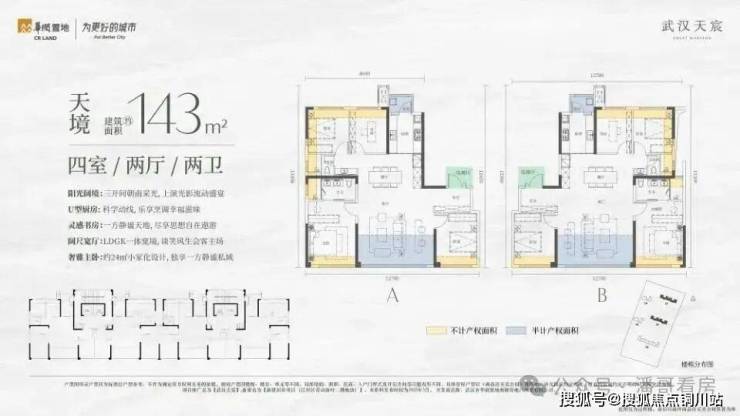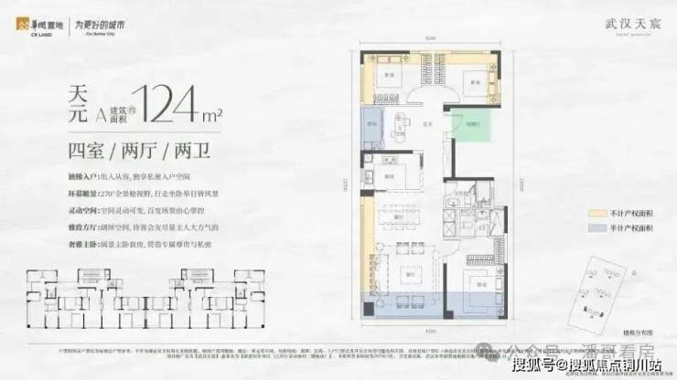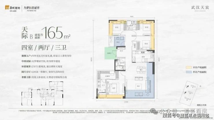 2、4号楼小高层里面是建面约165平左右的户型,也有两种结构,一个是南北朝向的南向大开间户型,做了南向双套房。因为本身公摊更低,加上拓展面积,165平户型得房率可以达到约100%,标准的负公摊。