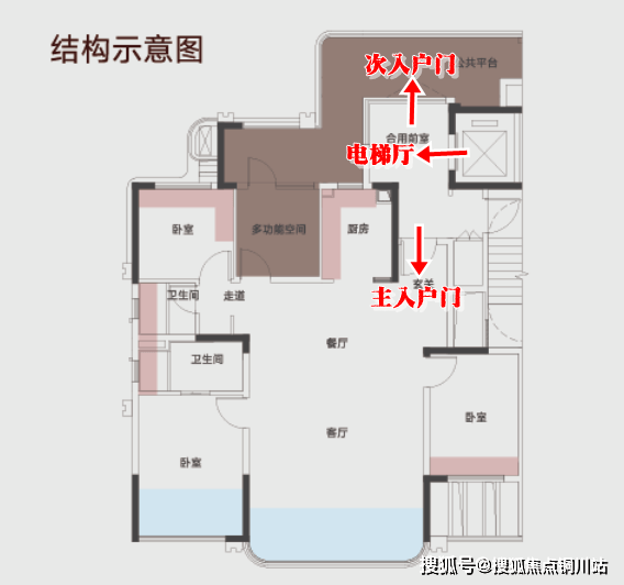 两梯两户设计,户户可实现双入户体验,以最小户型建面约124㎡产品为例,从电梯厅出来,它可以分别从常规的主入户门进去,也可从北向公共平台入户,这在以往,都是豪宅的特权。