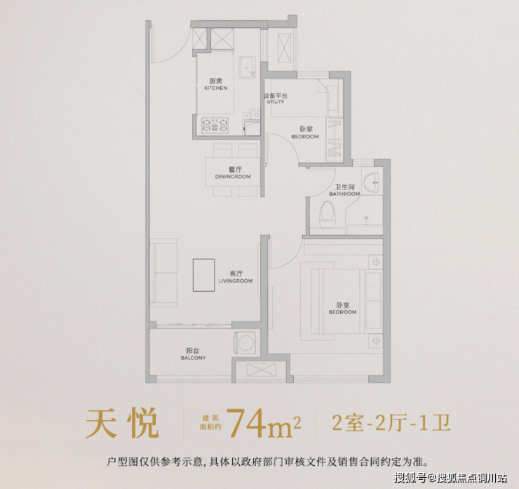 建面约74㎡ 2室2厅1卫: