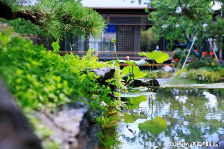 锦鲤池结合净化系统设计,水中锦鲤游弋,与置石、植被相映成趣。深池倒影之中,建筑轮廓朦胧可见,动静之间,情趣盎然。