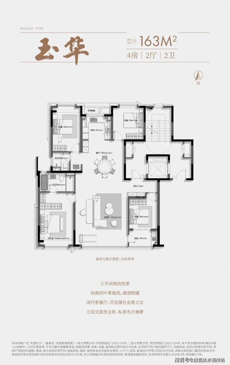 此次开放的163㎡户型,采用类一梯一户设计。电梯前室可转化为家的延伸空间,既保证归家私密性,也增加实际使用面积。户内为经典“四叶草”格局,四个卧室分置四角,以中央家庭公区为核心。这种布局的优势在于:三代同堂既有欢聚的交集,又能守护各自的安宁。