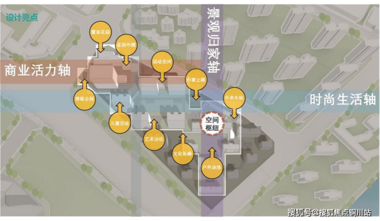 构建景观归家轴,时尚生活轴,商业活力轴,联动整体布局,编织“欢肆”烟火生活图录。住宅区双入口设置,实现分区分流,提升归属感与尊享感。车行入口置于北侧大港六路,坡道结合裙房,实现人车分流。