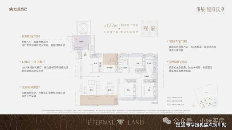 建面约127平米户型直接做到了约6.7米宴会级大横厅+四房的格局。