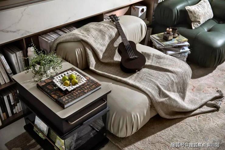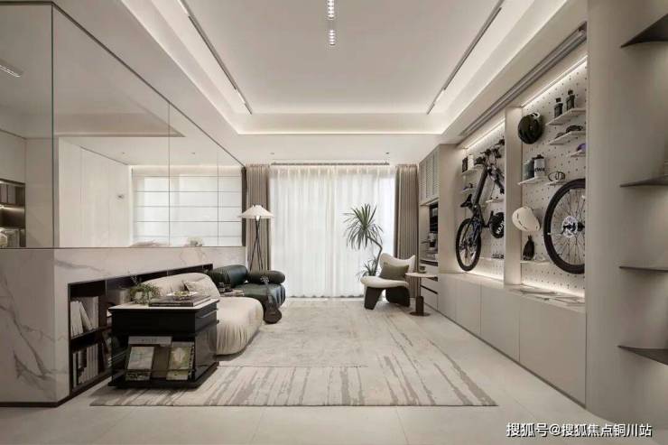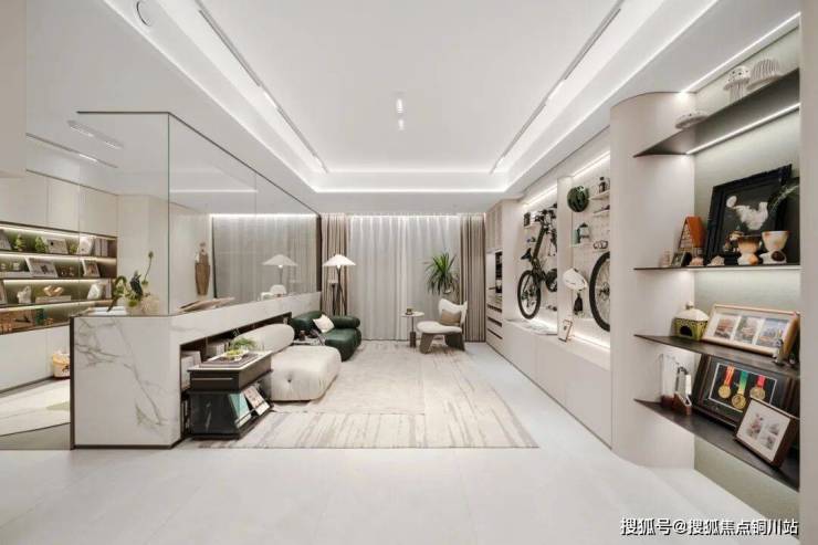 还有客厅中那一道最“惹眼”的玻璃墙下方,也预留出了“落地开放格”(仅为样板房示意,具体以交付为准),年轻人钟爱的小茶几、移动零食架、孩子的玩具绘本……都可以随取随放。