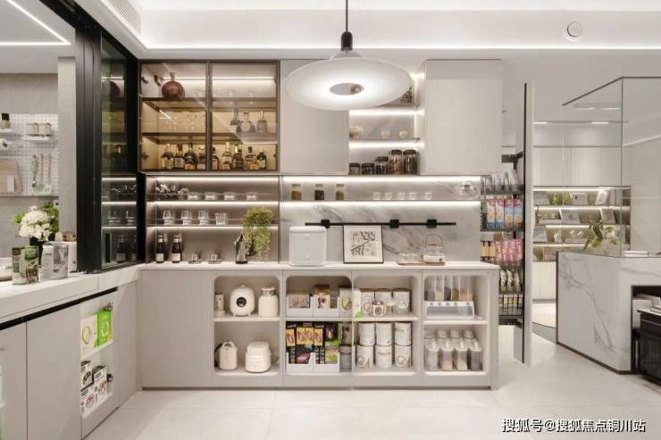 比如厨房的“全系收纳”,不仅是U型空间的吊柜和橱柜,“岛台”下方的柜体更是实现了双侧开门,一些餐客厅常用的物品也能“就近存取”了。