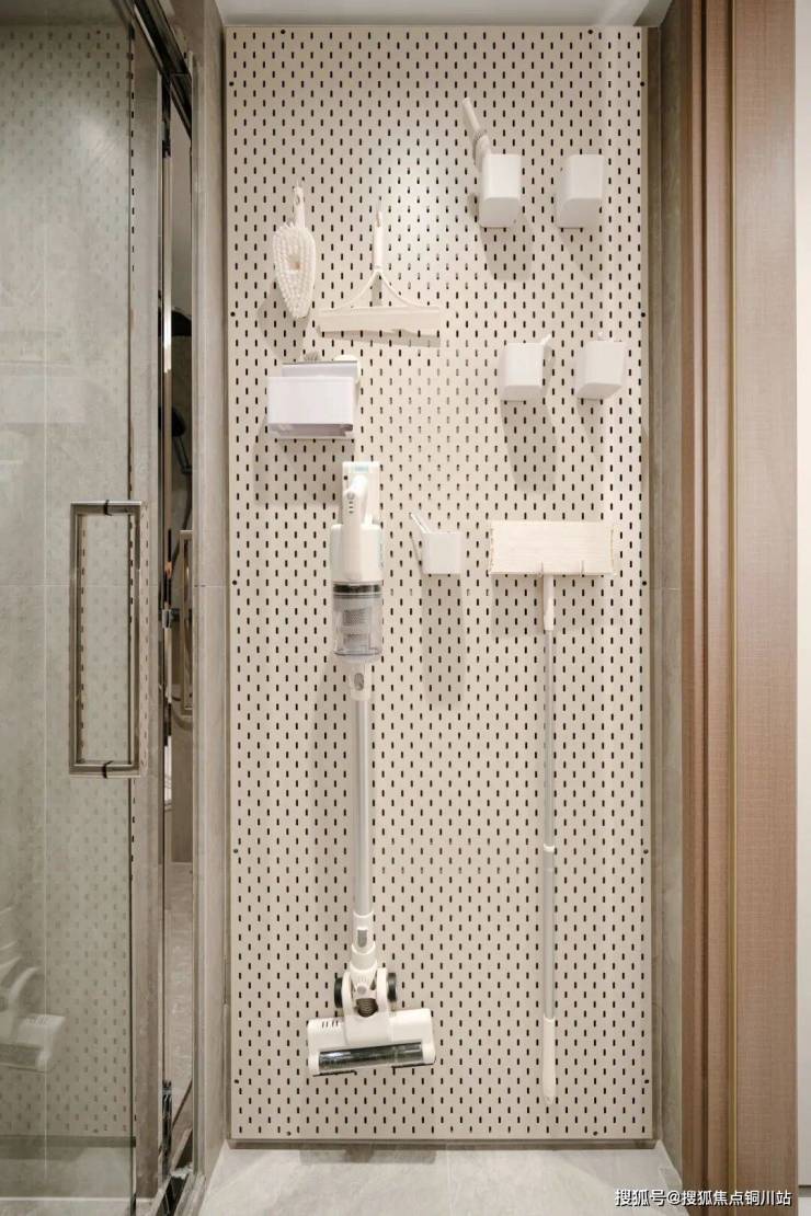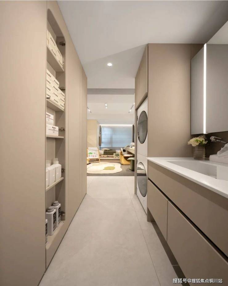 此外,两个卫生间的收纳也进一步升级,三段式分离的公卫预留了洗烘机、扫地机、家政用具的全系收纳空间,主卧卫生间更配置了一个壁挂式mini冰箱,让女主人护肤品的收纳更“贴心”。
