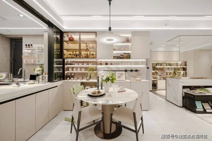 客厅的背景墙也可以设计成整面“壁挂式”的收纳墙,搭配可升降投影幕布,随时“秒变”家庭影院。更夸张的是,餐厅墙体一侧还做了抽出式的零食柜,这样的创新设计不少宁波人更是第一次见到(仅为样板房示意,具体以交付为准)。