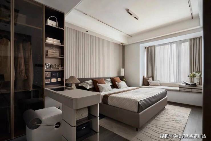 如主卧空间精心辟出了一个“L型”的衣帽间+梳妆桌(仅为样板房示意,具体以交付为准),再加上独立卫生间与景观飘窗,即便是建筑面积约100㎡的户型,也能轻松拉出140㎡以上大宅才有的“全功能套房”体验。