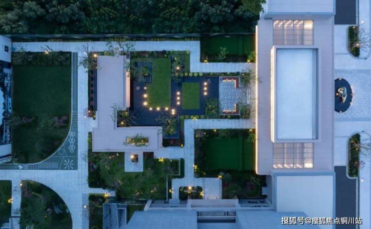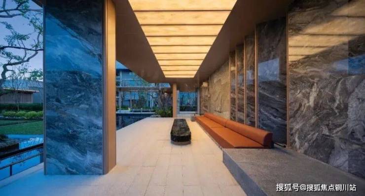 中央苏格兰银灰廊架搭起业主活动灰空间,中国黑老皮石景墙衬出仪式感,千年雨痕凝于石上,光影洇开,是古今对话,藏江南气韵。