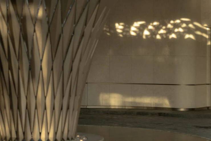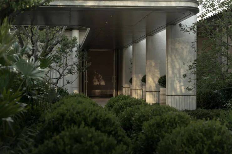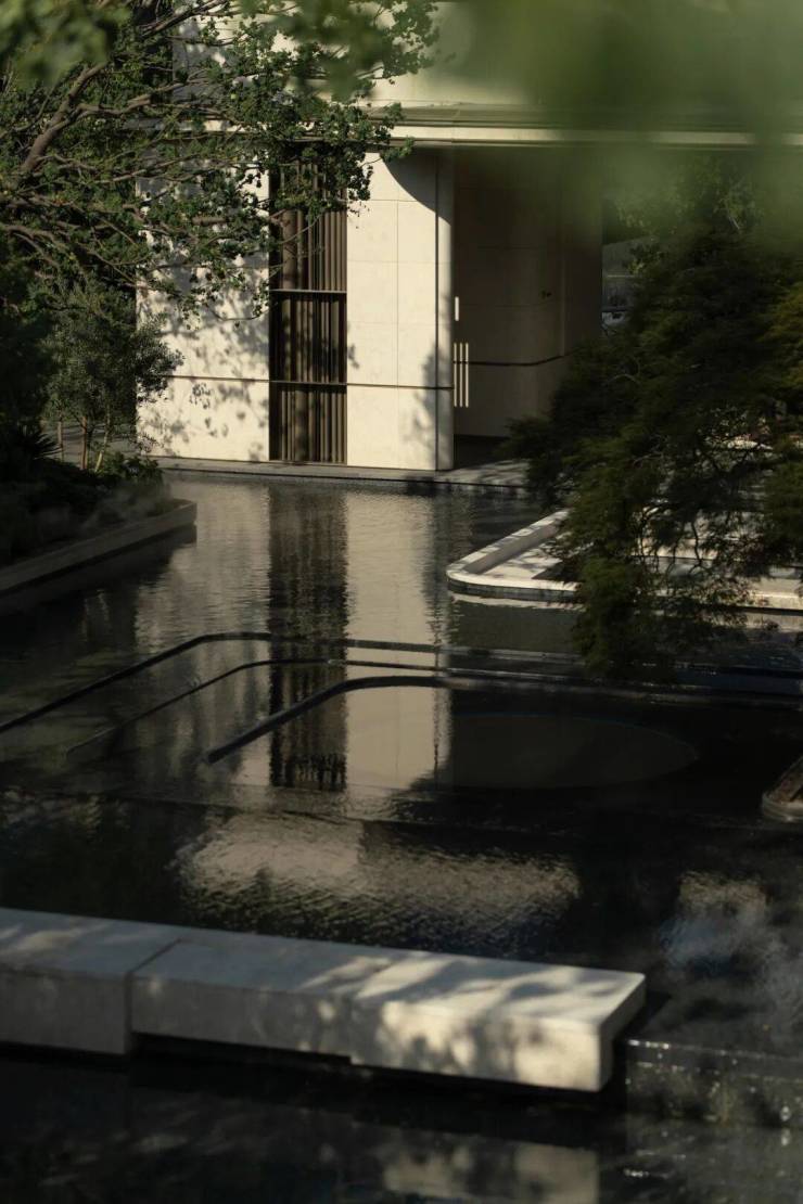 The Venato stone, the texture of bronze-colored aluminum panels, and the nearly 200-year-old famous Japanese maple with spreading branches form a visual echo, bringing endless shade to those who stay here.