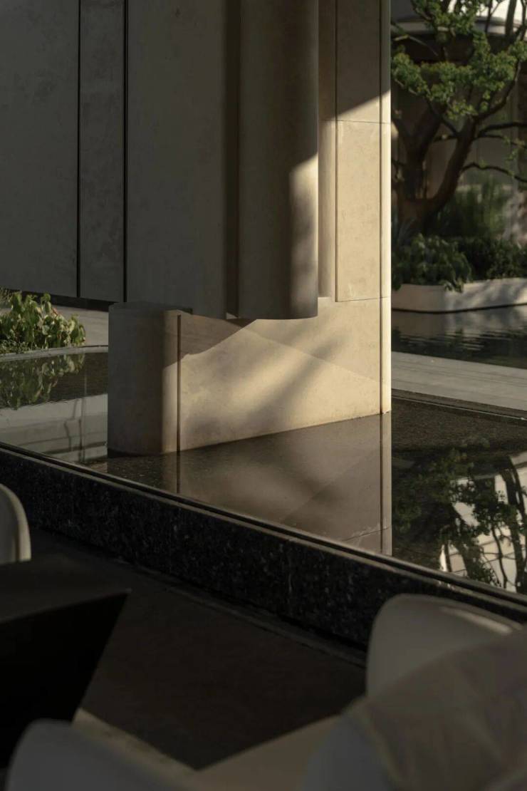 墙面细节卷边,凹槽脱缝,碗状弧形水景边,尽显细节处理,统一协调的米色色调,材料奢石选用维纳多大理石,独具风格而不失仪式庄严感,以克制素雅的造型型态,演绎精致生活氛围,强化豪宅级定制专属感。