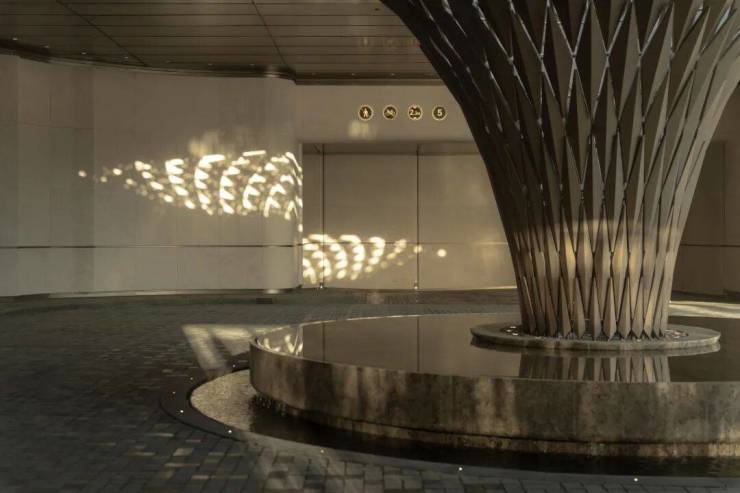 入口采用酒店式环岛落客,中心设置寓意「天下四聚」的艺术装置,不仅展现出归家的蕴贵门面和仪式感,还与苏扇工艺打造的黄金池底基座互相辉映。
