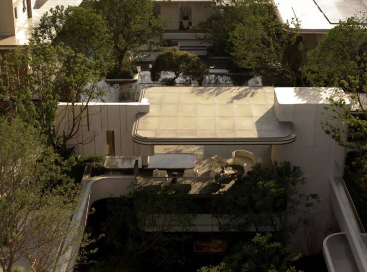 维纳多石材、古铜色的铝板肌理与枝桠舒展近200年名木羽毛枫形成视觉呼应,为驻留其中的人,带来无尽的浓荫环绕。