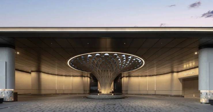 The entrance features a hotel-style roundabout drop-off area, with an art installation symbolizing "the four great gatherings under heaven" set at its center. This not only presents a noble and ceremonial facade for returning home but also echoes the golden pool base crafted with Suzhou fan craftsmanship.