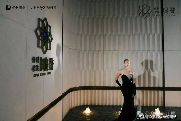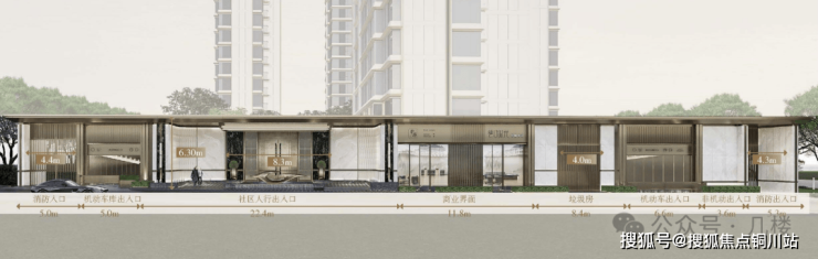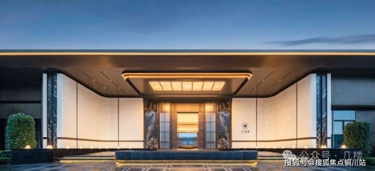看图片,保利金茂·琅誉的社区入口,其门庭宽度达到约66米左右。门前设置了中轴对称的水景,整体门庭以艺术奢石、金属与玻璃相组合,呈现出海派摩登风格。