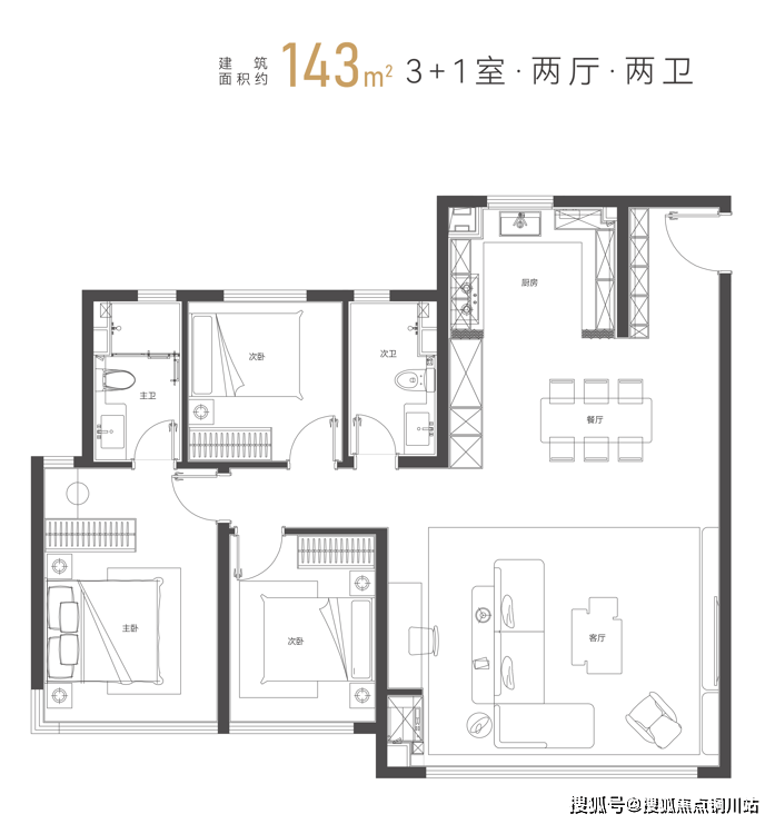 边户143㎡户型是精装效果样板间,3+1布局的宽厅三室,宽厅开间约6.2米。大落地窗是亮点,起地只有5公分左右,而且南向阳台+两个南向卧室都是落地窗,采光观景视野更出众。其主卧采用了L型飘窗,多一面采光、多一面景观。铸铝入户门美观厚重,搭配6合一智能锁,安全使用。