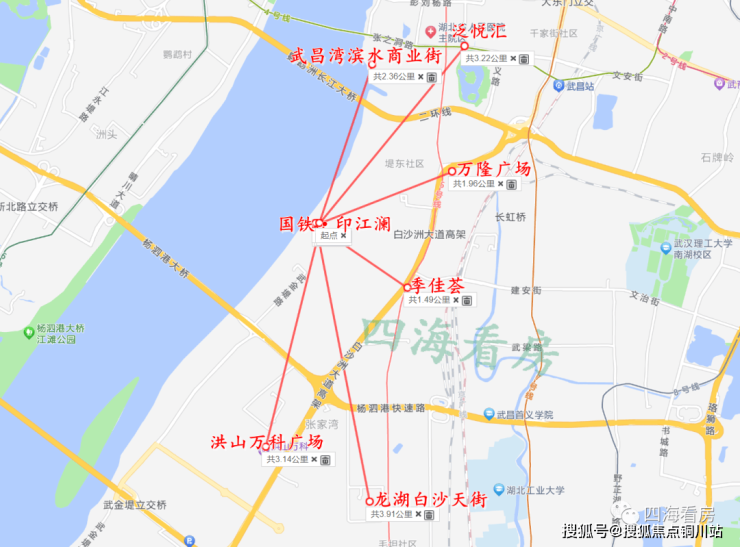 另外,季佳荟和万隆广场距离项目比较近,直线距离约1.5-2公里,项目距离洪山万科广场、龙湖白沙天街、泛悦汇也在4公里范围内,尤其值得一提的是武昌湾滨水商业街,打造得非常高端,未来右岸大道打通后,项目到这里会快捷又方便。