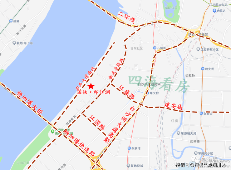 国铁·印江澜位于临江大道与紫都路交汇处,在楼市划分上属于武昌滨江板块,行政划分属于武昌区,距离二环线1.8公里,属于二环边。