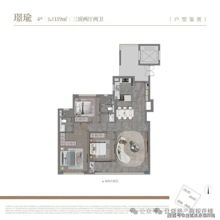 建面约119平,三房两卫:双开门电梯,作为中间户有独立电梯前室,确实非常赞。