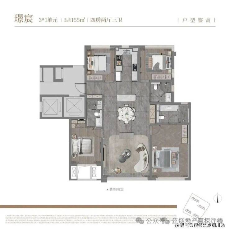建面约155平,四房三卫:与153户型结构近似,主要区别是主卧没有双面全景舱飘窗,因此得房率也低于153户型,导致使用面积相近情况下,建筑面积更大。