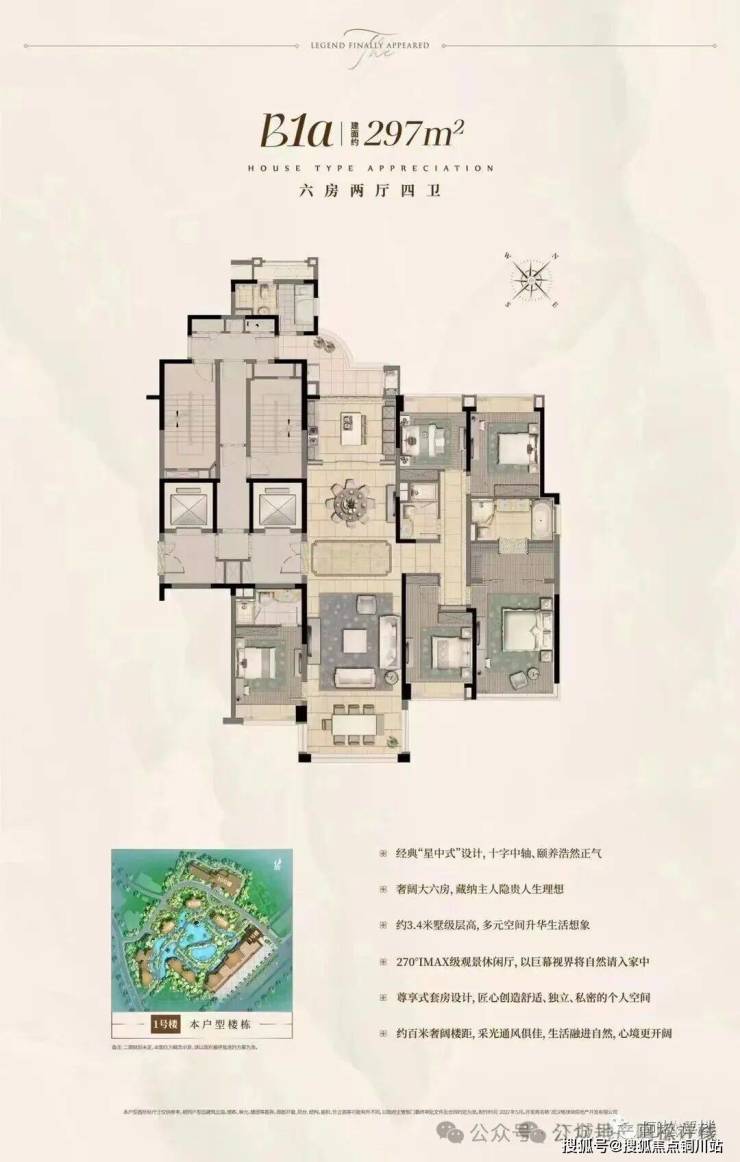1号楼均为建面约297㎡户型,户型格局与上面约275㎡户型差不多,只不过建筑面积大了20多个平。