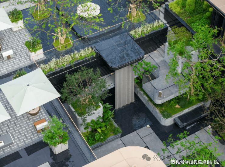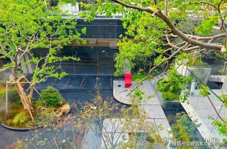 下沉式庭院与一层地面高差达5.2米,巧妙利用高度差与围合设计,打造了一个立体花园,层次鲜明,美不胜收。飞瀑如丝带般串联起地面与下沉空间,辅以阶梯式绿化与错落有致的镜面树池平台,营造出强烈的空间立体感。庭院的选材同样考究,如瀑布两侧挺拔的老桂树与水池中的羽毛枫,不仅美化了环境,更蕴含着美好的寓意,每一处细节都经过精心打磨,品质非凡。