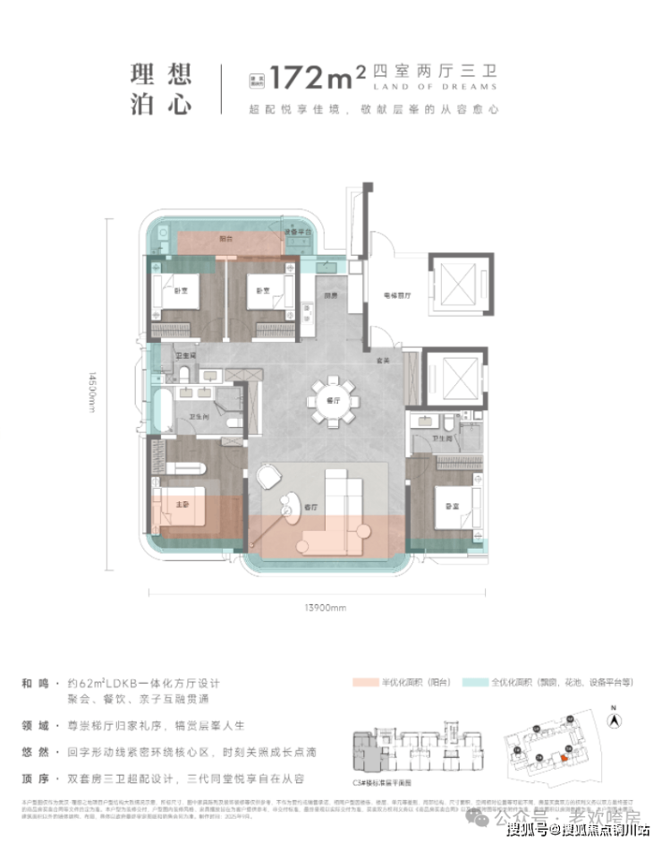 建面约172㎡四室两厅三卫户型,则为多代同堂或注重私密的家庭设计,