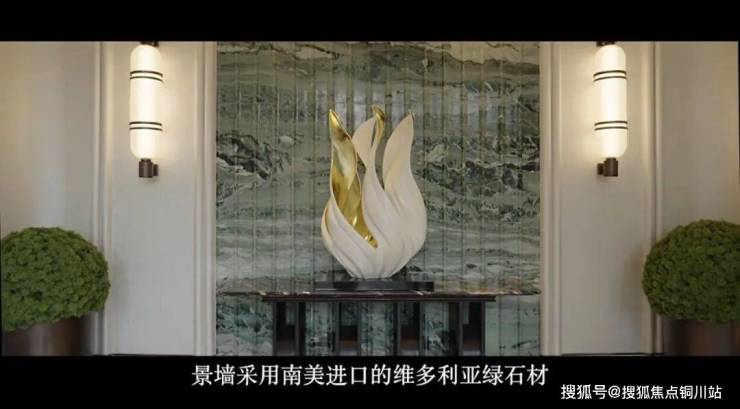 入口过厅,景墙采用南美进口的维多利亚绿石材,石皮板墙面纹理细腻,水刀拼花地面精致典雅。