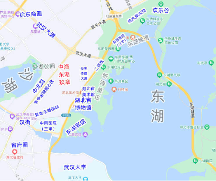 休闲配套:项目地处两湖绿肺之间,西侧约 700 米左右就是沙湖,东侧约 1000 米左右就是东湖,1 公里内还有湖北美术馆、省博物馆等人文休闲配套。
