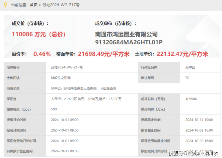 鸿湖上,即,苏地2024-WG-Z17号地块项目,位于吴中经开区城南街道白云街南侧、下田路西侧,是2024年10月11日,南通市鸿远置业有限公司以总价110086万元竞得,成交楼面价21698元/平,溢价率0.46%。