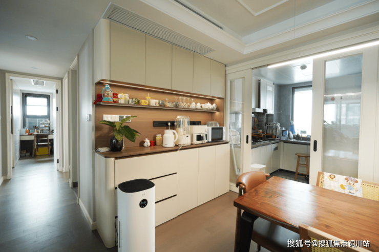 在缪女士家,餐边柜还可以化身生活策展台,红酒杯折射着暖黄灯光,珍藏茶具与家居用品错落陈列。周末夜晚,三两好友举杯轻碰,寻常日子因仪式感而熠熠生辉。