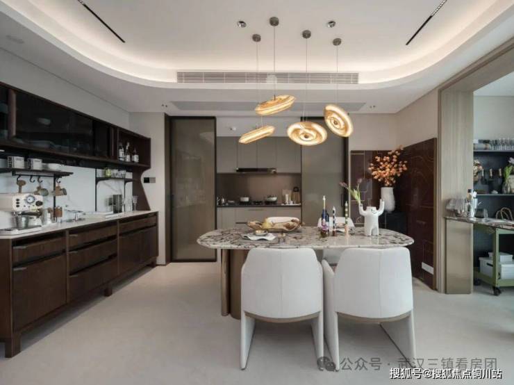 客厅浓厚的文化与独特的艺术气质,洞石及千层岩纹理岩板,厨房夹丝玻璃门中间夹定制绢丝,为空间设计增添了亮点,带来一种优雅高级的质感。