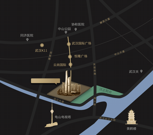 核心区位:武汉 BFC 复星外滩中心御江廷位于硚口区汉正街与友谊南路交汇处,地处汉口内环滨江,与汉正阳台相毗邻,是两江交汇的稀缺核心地段,沿长江主轴布局,未来将成为武汉的城市名片。