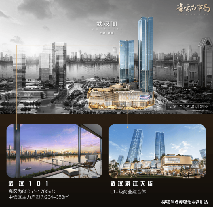 为了打造专属武汉101业主的高空界面,为了极致利用江景资源和对岸城市天际线,武汉101采用了国外顶豪公寓惯用的高中低区分户方式。