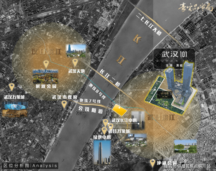 武汉101所在的武昌滨江汇聚着已建成的武汉第一高楼,开业不久的武昌万象城,建设中的武汉滨江天街、武汉长江中心、月亮湾城市阳台等武汉顶尖地标和商业商务等顶尖资源。