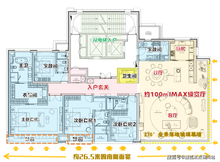 前湾国际此次加推的378㎡户型,全是“两梯一户”、“一层一户”布局,所有房源正对尚贤河湿地公园,约26.5米南向面宽+270°全景落地玻璃幕墙流转着它的晨昏四季。