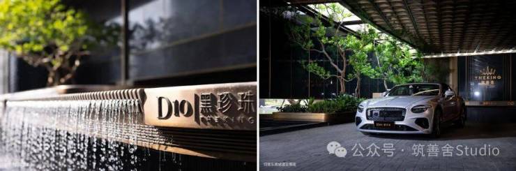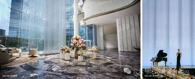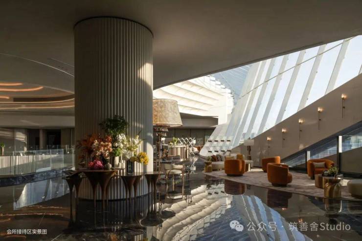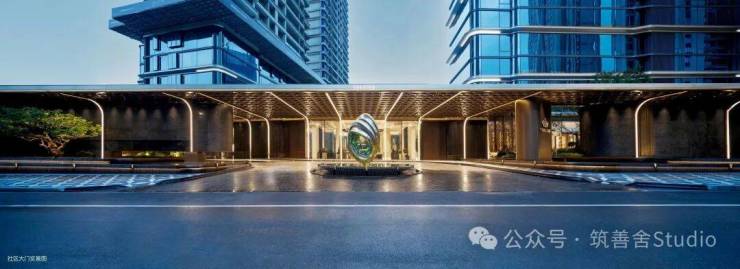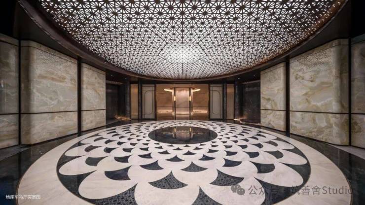 社区主入口横向展开面长达百米、高6米,参考酒店式入户设计,布置环岛落客区奢侈空间尺度。范思哲黑与安哥拉黑石材低调华贵,顶面千片鳞片造型似江浪灵动,百达翡翠原石与黄铜镶嵌而成“王冠之瞳”,整体空间奢华与优雅并存。