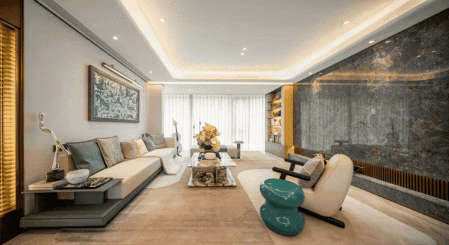 水景选用蓝星钻石材,面墙采用库班绿石材,这些都是全国顶级豪宅才会使用的材质,搭配金属水帘,不仅增添了空间的质感,更蕴含着见水生财、财源滚滚的美好寓意。
