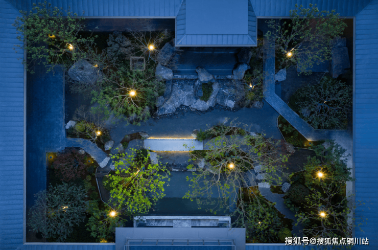 立于下沉庭院,耳畔是飞瀑流水,眼前是石桥倒映澄澈水面,四周绿意盎然,俨然一派闹中寻静的都市“桃花源”。