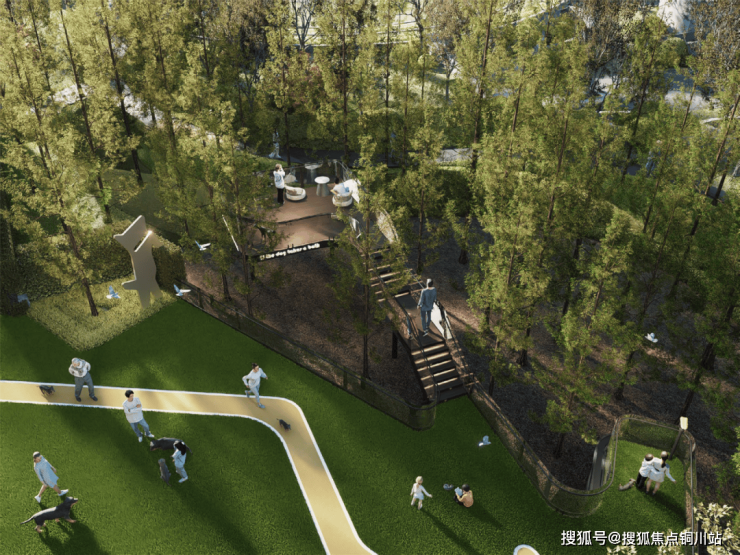 园林东侧,运动场、休闲平台与林下会客区自然衔接,形成一片充满活力的全龄社交场域。