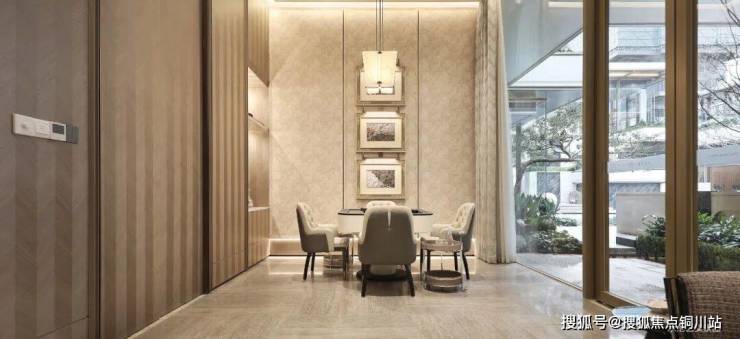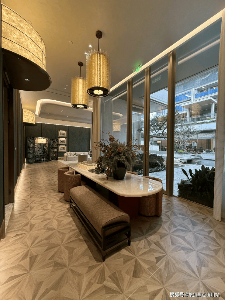 归家动线以环绕下沉式庭院布置。漫步在连廊之上,以水为引再铺陈精选的绿植,随手一拍,松弛气场油然而生。