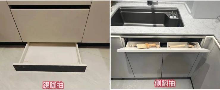 关键是,金茂还很擅长把角落里的鸡肋空间,转化成很顺手的高频收纳。比方在厨房,金茂把最下层的抽屉设计成“踢脚抽”,给高处的柜子设计天使拉篮,水槽边缘加装侧翻抽……「顺手」是什么感觉?就像在厨房里施展魔法一样随心所欲。我们上图照片展示强大的收纳: