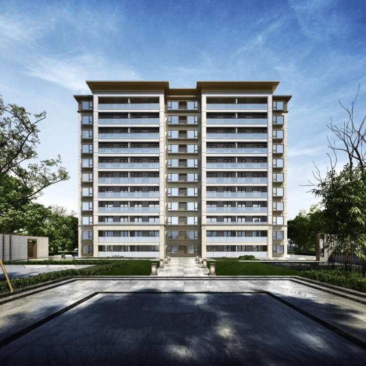 在建筑风格上充分融合中式美学与现代工艺,营建现代风格,以清新亮丽、东方意境为基调形成轻盈活泼的建筑形态,同时通过立柱、线条、玻璃形成简单明了的立面风格,整体线条以直线为主,富有时代气息,建筑立面精致典雅,整体造型稳重大气。